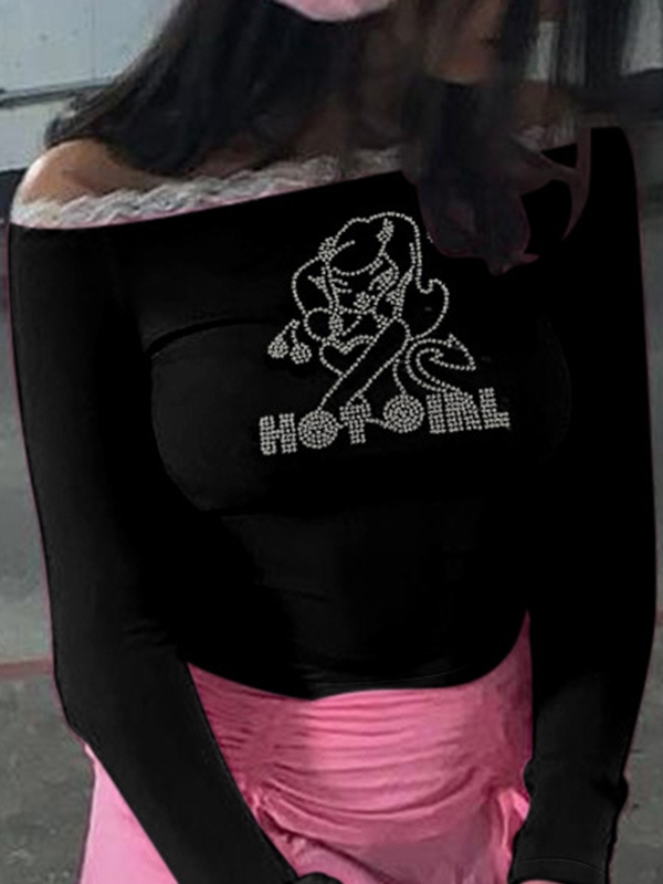 Schulterfreies, langärmliges T-Shirt mit Cartoon-Strass-Print und Spitzenbesatz