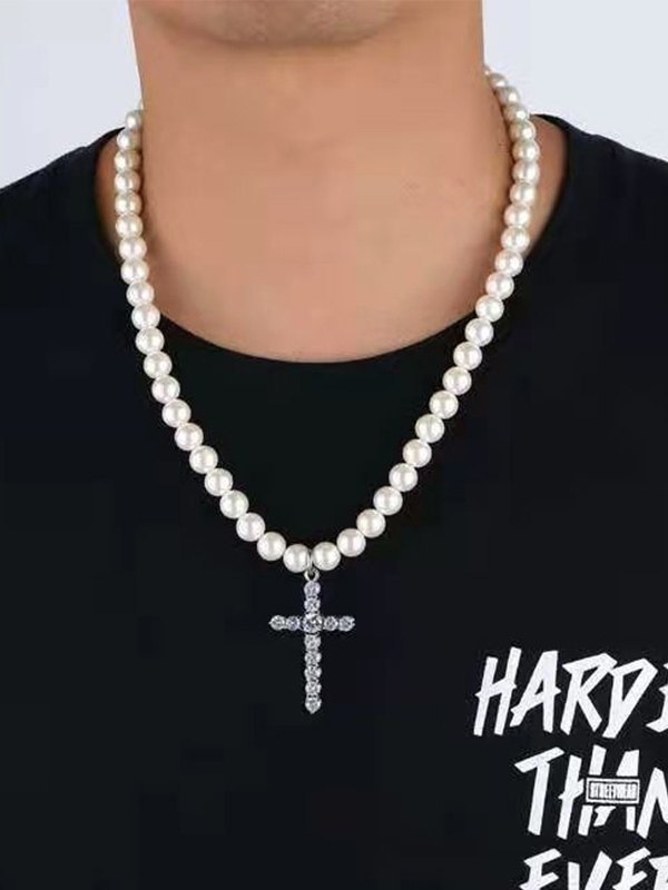 Herren Strass Kreuz Anhänger Faux Perlenkette